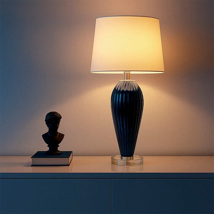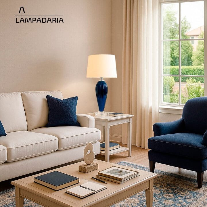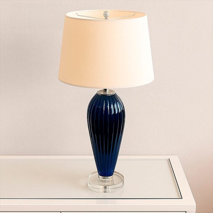 O Abajur Nightglass da Lampadaria é a perfeita fusão entre design clássico moderno, brilho e sofisticação. Sua base alta, em cristal azul noite moldada no formato de balaústre com frisos boleados e detalhes em cristal transparente, adiciona um toque de requinte e elegância ao ambiente. A cúpula translúcida em tecido algodão texturizado na cor branca distribui a luz uniformemente para cima e para baixo, criando uma atmosfera acolhedora, enquanto difunde lateralmente, contribuindo para a iluminação geral do espaço.