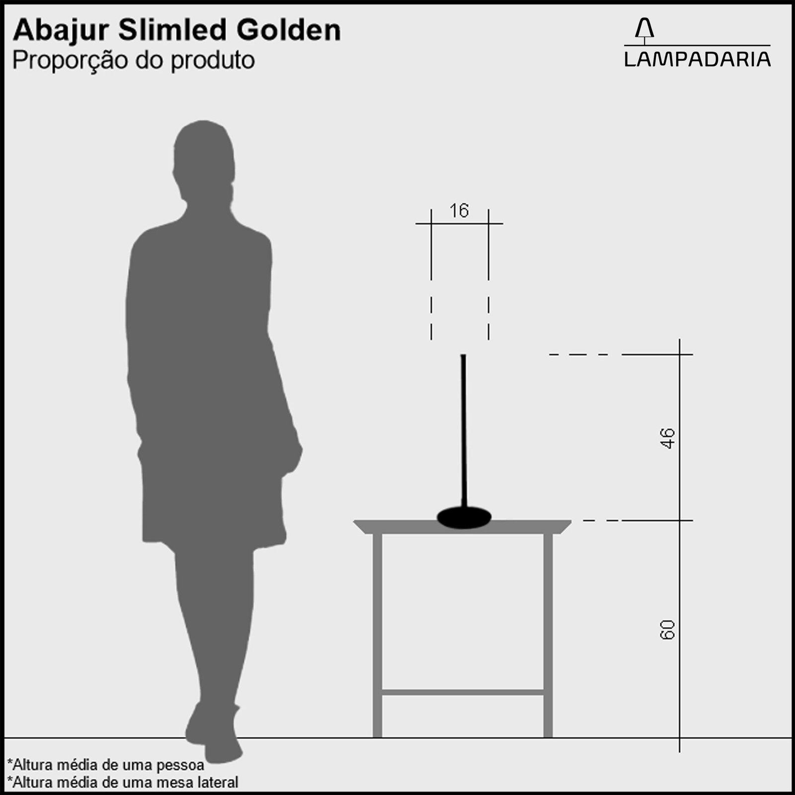 Ideal para salas de estar, quartos ou escritórios, o Abajur Slimled Gold proporciona iluminação de qualidade premium, utilizando lâmpada tubular LED de 5W (3.000K), garantindo uma luz suave, confortável e econômica. Seu acionamento é prático, por interruptor on-off, proporcionando mais conveniência no uso diário.