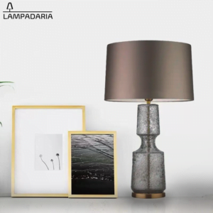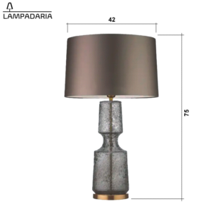 Abajur em vidro artesanal na cor smoke, cada peça é única e exclusiva, com detalhes em metal bronze e pantalha opaca em tecido algodão mercerizado na cor fumê, lâmpada Led E27 5w com temperatura de cor 3000K