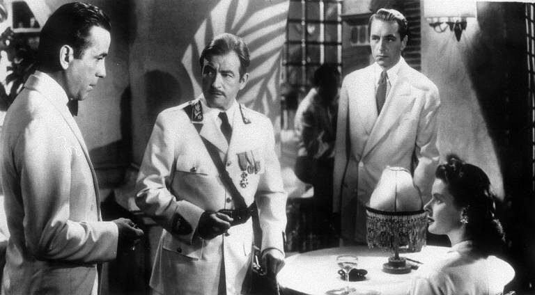 Em Casablanca (1942), as lâmpadas de mesa com cúpulas translúcidas suavizam a luz sobre Humphrey Bogart e Ingrid Bergman,